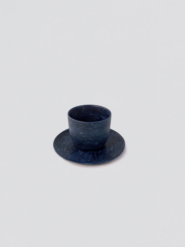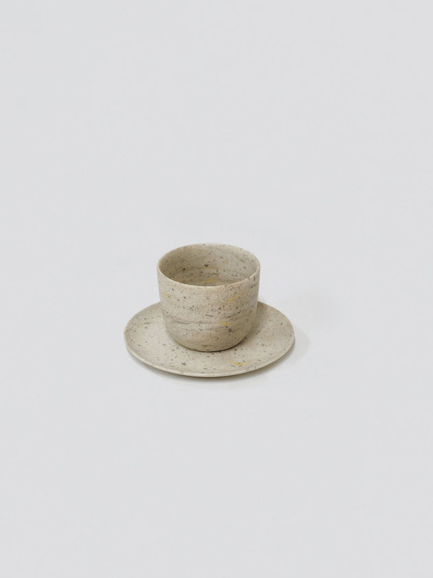 A tea cup and saucer set. The simple, handleless design is perfect for serving coffee, black tea, herbal tea, or Japanese tea. Made of Corian®︎, known for its excellent heat retention properties, your hot beverages stay warm longer for a relaxing tea time.